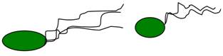 Rysunek przedstawiający Photobacterium phosphoreum , który porusza się za pomocą biegunowo rozmieszczonych rzęsek.