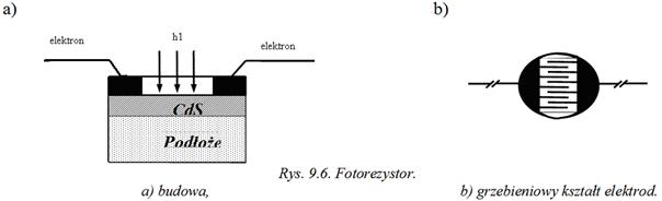 Fotorezystory buduje się bardzo często w formie cienkich półprzewodnikowych warstw monokrystalicznych albo polikrystalicznych nałożonych izolacyjne np. szklane podłoże (rys.9.6a). Substancje światłoczułe dzielą dwie metalowe elektrody posiadające wyprowadzenia. Elektrody te najczęściej posiadają formę grzebieniową (rys.9.6b). Nad powierzchnią światłoczułą lokuje się okno oraz zamyka w obudowie, chroniącej przed uszkodzeniami, niekiedy pozwalającej na pracę w niskiej temperaturze (tzw. naczynie Dewara).