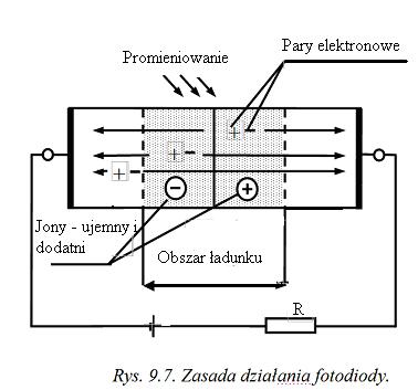 Przy oświetleniu fotodiody niedaleko jej powierzchni są generowane pary nośników dziura-elektron. Obszar ładunku przestrzennego oraz powiązana z nim bariera potencjału pozwalają na przepływ nośników większościowych, natomiast nośniki mniejszościowe (tj. dziury w obszarze n oraz elektrony w obszarze p) przedostają się do obszaru ładunku przestrzennego, są przyspieszane, pokonują złącze (rys.9.7a). Przez złącze przepływa dodatkowy prąd fotoelektryczny IP. Prąd ten jest proporcjonalny do mocy promieniowania padającego na jej powierzchnię, nie uzależniony jest od wartości obciążenia oraz napięcia wstecznej polaryzacji.