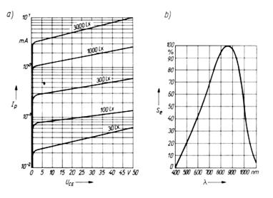 Rys. 9.11. Fototranzystor: a) charakterystyka prądowo - napięciowa, b)charakterystyka czułości widmowej.