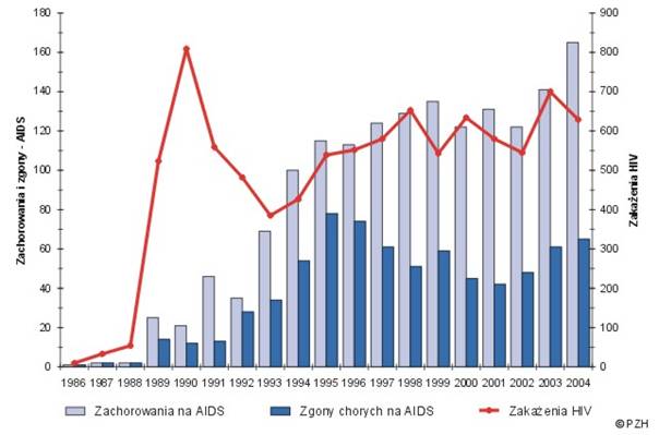 Zakażenia HIV, zachorowania na AIDS i zgony chorych na AIDS w latach 1986-2004