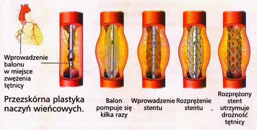 - przezskórna plastyka naczyń krwionośnych (wieńcowych) - PACA - metoda ta polega na rozszerzeniu zaczopowanego odcinka naczynia poprzez wprowadzenie do niego balonika i napompowanie go; rozszerzone w ten sposób miejsce stabilizuje się za pomocą stentów, utrzymujących drożność (rysunek 4.)