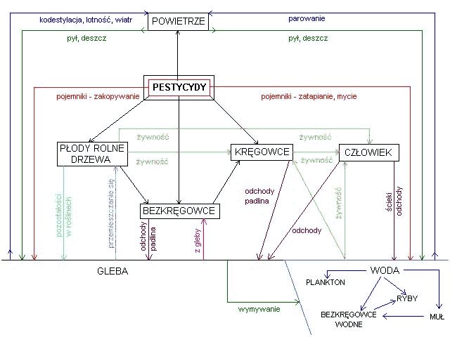 Pestycydy, po tym jak zostaną użyte na rośliny, albo na glebę, przechodzą cykl przemian, fizycznych, chemicznych i biologicznych i zanieczyszczają glebę, wody a wraz z nimi, zostają przeniesione do tkanek roślinnych i zwierzęcych a nawet ludzkich.