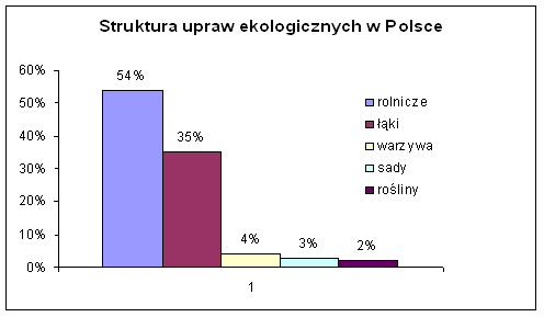 W naszym kraju istnieje obecnie około 950 gospodarstw rolnych zajmujących się uprawami ekologicznymi. Kolejne 600 stara się zmienić metody produkcji, tak aby można je było zaklasyfikować jako ekologiczne. Poniższy wykres prezentuje strukturę upraw biodynamicznych w Polsce.
