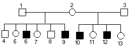 Mężczyźni oznaczeni są kwadratami, kobiety kółkami, osoby zdrowe na biało, obciążone chorobą genetyczną na czarno. Widać, że chorują tylko mężczyźni, zatem choroba musi być dziedziczona w chromosomie X.