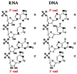 Rycina 1. Szczegóły budowy chemicznej RNA i DNA. Przedstawiono tylko połówkę podwójnej nici DNA.