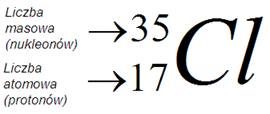 Suma nukleonów w jądrze danego pierwiastka jest to tzw. liczba masowa (A). Ona także charakteryzuje miejsce danego pierwiastka w układzie okresowym, co przedstawia poniższy przykład pierwiastka chloru: