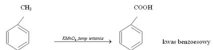 - reaguje z roztworem KMnO4 w wyniku czego powstaje kwas benzoesowy: