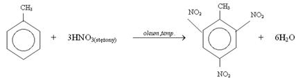 - do wytwarzania środków wybuchowych: trotylu, czyli 2,4,6-trójnitrotoluenu, TNT; zgodnie z równaniem reakcji: