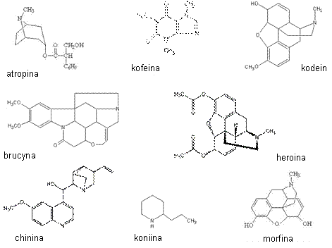 - wiele alkaloidów ma odmienną od wymienionych, bardziej skomplikowaną budowę, np. strychnina i brucyna.