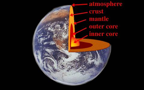 Na powyższym rysunku została zaznaczona idąc od zewnątrz: atmosfera czyli warstwa gazów otaczająca Ziemię, skorupa ziemska, płaszcz ziemi, jądro zewnętrzne i jądro wewnętrzne.