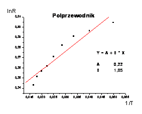 Wykres ten nie jest zbyt dokładny, ponieważ dokonane przez nas pomiary są bardzo rozbieżne. Jednak do wykresu dopasowano prostą regresji i wyznaczono z niej współczynnik kierunkowy: B = 1,85. Stała B jest równa energii aktywacji elektronów w półprzewodniku: lnR = Ea/(kBT), gdzie kB to stała Boltzmanna. Na tej podstawie możemy napisać B = Ea/ kB, czyli Ea = BkB. Po obliczeniu otrzymaliśmy wynik Ea = 4,2 eV. Energia aktywacji jest jednocześnie szerokością przerwy energetycznej w półprzewodniku.