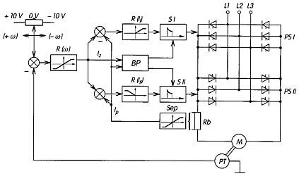 PSI, PSII - sekcje przekształtnika, M - silnik, PT - prądnica tachometryczna, R (ω) - regulator prędkości, R (II), R (III) - regulatory prądu sekcji PSI oraz PSII, SI, SII - sterowniki dla obu sekcji, BP - blokada wprowadzająca sekcje PSI oraz PSII do pracy, Sep - układ z galwaniczną separacją obwodów do przetwarzania sygnału prądu o napięciu 0 - 60 mV na sygnał o napięciu do 10 V, Rb - bocznik.