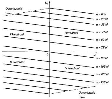 Układy przekształtników nawrotnych. Trójfazowe tyrystorowe przekształtniki mostkowe działają w I kwadracie wykresu Ud = f(Id), przy sterowaniu w zakresie 30-90°el. Przy większych wartościach kąta wysterowania, w zakresie 90-150°el, przekształtnik "przechodzi" do IV kwadratu charakterystyki (rys. 3.1 oraz 3.15). W kwadracie tym wartość średnia napięcia przekształtnika jest ujemna. Znaczy to, iż energia jest odbierana ze źródła prądu stałego a następnie skierowana do sieci.