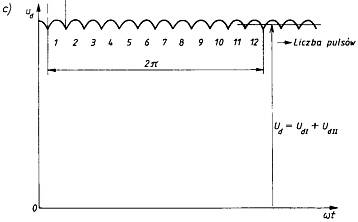 Rys. 3.17. Przebiegi napięć w przekształtniku skonstruowanych z dwóch mostków tyrystorowych złączonych szeregowo: a) na wyjściu sekcji I, b) na wyjściu sekcji II, c) na wyjściu przekształtnika.