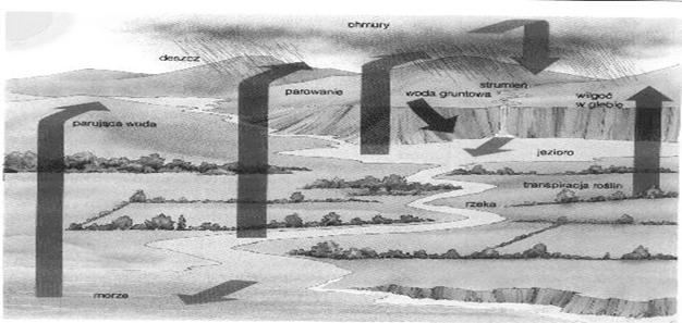 Woda wyparowuje z powierzchni oceanów oraz mórz, w postaci chmur przemieszcza się o ogromne odległości, by jako opady atmosferyczne zasilić ląd ora pojemniki śródladowe. Pózniej wsiąkając w glebę, uzupełnia powstałe braki w rzekach, wodach gruntowych a następnie wraca do morza.