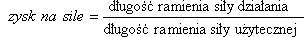 Przekładnia, czyli zyska na sile wyraża się w przypadku dźwigni jednostronnej tak samo jak w przypadku dźwigni dwustronnej, czyli: