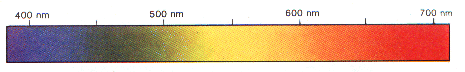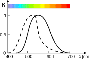 Promieniowanie widzialne, określane też jako po prostu światło widzialne, to promieniowanie elektromagnetyczne o długościach fal z zakresu do 400 nm. do 700 nm. Promieniowanie w tych granicach rejestruje oko ludzkie, jednak niektóre organizmy żywe mogą rejestrować inny zakres, np. pszczoły rejestrują promieniowanie ultrafioletowe. Oko ludzkie najlepiej radzi sobie z środkiem zakresu długości fal, czyli ok., 550 nm, co odpowiada barwie żółto-zielonej. Najgorzej odbiera barwy pochodzące z granic tego zakresu. Nasze oko wyposażone jest w specjalne receptory, które położone są na siatkówce. Receptory te to tzw. pręciki, których jest 125 milionów i czopki - 6,5 miliona. Czopki odpowiedzialne są za rozróżnianie barw, gdy znajduje się w dobrze oświetlonym pomieszczeniu. Wyposażone są one w 3 rodzaje barwników, które charakteryzują się maksymalną czułością dla barw z obszaru czerwieni, oranżu i błękitu. W wyniku oddziaływania światła z tymi barwnikami, wysyłają one impulsy do mózgu gdzie następuje identyfikacja barwy. Dodatkowo czopki także są w stanie rejestrować natężenie światła - jego intensywność. Jak już wspomniano czopki rozróżniają barwy tylko w przypadku gdy otoczenie jest dobrze oświetlone. Gdy oświetlenie to jest niedostateczne, czopki przestają pracować, a uaktywniają się pręciki. Zadaniem pręcików jest rejestrowanie obiektów przy słabym natężeniu światła. Odbierają one wówczas obiekty jako jednobarwne. W skład pręcików wchodzi barwnik - radopsyna, która jest wysoce czuła na kolory niebieski i zielony, a w niewielkim stopniu na kolor czerwony. Dlatego też kolor czerwony w nocy odbieramy zupełnie podobnie jak kolor czarny. Tak więc jak widać czułość pręcików jest bardziej ukierunkowana na fale od długościach bliższych barwie fioletowej (patrz wykres poniżej).