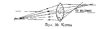 Koma - w tym wypadku mamy do czynienia z podobną wadą jak w przypadku aberacji sferycznej, jednak dotyczy ona obrazów punktów, które znajdują się poza główną osią optyczną. Objawia się to w ten sposób, iż promienie świetlne wychodzące z punktu, który nie leży na głównej osi optycznej, są ogniskowane w różnych punktach w zależności od ich miejsca załamania na soczewce. Dobrze ilustruje ten przykład poniższy rysunek: