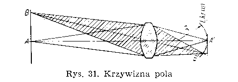 Krzywizna pola - wada ta polega na tym, iż przedmiot ustawiony prostopadle do głównej osi optycznej nie daje także obrazu w tej samej płaszczyźnie. Jeśli spojrzymy na poniższy rysunek to zauważymy że obrazem punktów A i B, które leżą na prostej prostopadłej do głównej osi optycznej są punkty A' i B', które leżą nie na linii prostej, ale na pewnej krzywej. Wadę tą nazywamy krzywizną pola. Można ją zaobserwować jako rozmycie pewnych punktów obrazów na ekranie ustawionym za soczewką. Występuje ona w ogólności przy zastosowaniu pojedynczych soczewek.