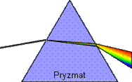Jeżeli na pryzmat będzie padać wiązka światła białego, to ustawiając za nim ekran zaobserwujemy powstanie pięknej tęczy - wynik rozszczepienia światła białego na składowe barwy, czyli fale elektromagnetyczne o różnej długości. Tak powstały obraz nazywamy też widmem światła białego. Jeśli przyjrzymy się dokładniej tej tęczy to zauważymy, że kolor czerwony najmniej odchylił się od początkowego kierunku padającej wiązki, a kolor niebieski najbardziej. Wiąże się to z tym, że współczynnik załamania, tak jak już powiedzieliśmy zależy od długości fali. Przyjmuje on tym większą wartość im większa jest długość fali. Dzięki wyznaczeniu różnic pomiędzy kątami załamania światła dla poszczególnych barw, możemy wyznaczyć także odpowiednie ich współczynniki załamania. Różnica pomiędzy współczynnikiem załamania dla barwy czerwonej, a tym dla barwy niebieskiej stanowi wyznacznik charakteryzujący dany pryzmat pod względem możliwości rozszczepienia światła - jest miarą dyspersji pryzmatu. Poniżej zaprezentowano widmo światła białego.
