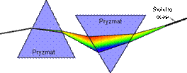 Można się jeszcze dodatkowo zastanowić, czy w pewien sposób nie można zebrać tak powstałego widma światła białego i z powrotem otrzymać wiązkę światła białego. Otóż można tego dokonać stosując jeszcze jeden pryzmat w sposób pokazany na poniższym rysunku.