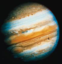 Jowisz to największa planeta w Układzie Słonecznym. Jego średnica jest 11 razy większa od średnicy ziemskiej a jego masa przewyższa 318 razy masę Ziemi. Średnia odległość Jowisza od Słońca wynosi 800 mln km. Okres obiegu planety wokół Słońca po swojej orbicie wynosi prawie 12 lat ziemskich.