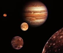 Wokół Jowisza krąży 30 satelitów, z których 4 posiadają znaczne rozmiary (Callisto, Io Europa i Ganimedes) a pozostałe są drobnymi ciałami np. Himalia, Leda, Elara. Istnieje teoria, że małe satelity Jowisza to dawne planetoidy przechwycone przez jego pole magnetyczne. Ganimedes jest największym księżycem naszego układu planetarnego a jego powierzchnię pokrywa cienka warstwa lodu, która posiada liczne ślady po uderzeniach meteorytów. Io jest zbudowany ze związków siarki i posiada liczne wulkany na swojej powierzchni. Co pewien czas następuje erupcja któregoś z nich podczas której wyrzucana jest ciekła siarka. Najjaśniejszym księżycem Jowisza jest Europa, posiadająca 100 kilometrową warstwę lodu idealnie odbijającą promienie świetlne. Obserwacje księżyców Jowisza, zwłaszcza tych największych, można prowadzić z Ziemi już przy użyciu małego teleskopu lub większej lornetki. Jako pierwszy księżycami Jowisza zainteresował się w 1610 roku Galileusz. Odkrycie księżyców krążących wokół Jowisza miało być potwierdzeniem układu heliocentrycznego Kopernika i miało służyć jako model Układu Słonecznego. W 1664 roku po raz pierwszy została zauważona Wielka Czerwona Plama na Jowiszu przez Roberta Hooka. Badanie prędkości światła w 1675 roku oparte było również na zaćmieniach księżyców Jowisza. Pierwszą sondą, która została wysłana na Jowisz był Pioneer. Bardzo cenne i interesujące zdjęcia zostały również wykonane przez sondy Voyager. Ostatnią sondą wysłaną w kierunku tej planety było Galileo. Dostarczyła ona informacji dotyczących częściowego przekroju planety. Oprócz tego Jowisz jest pod stałą obserwacją dzięki teleskopowi kosmicznemu Hubble, przesyłającemu stale na Ziemię najnowsze zdjęcia powierzchni Jowisza.