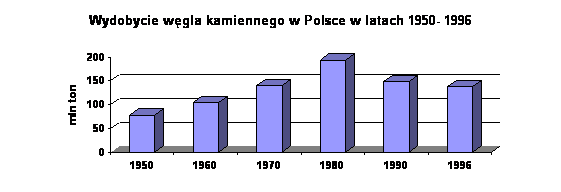 Jak widać na powyższym wykresie wydobycie węgla kamiennego systematycznie rosło aż do roku 1980 kiedy jego wartość wyniosła 193 mln ton. Od tego czasu notowany jest spadek wielkości wydobycia. Mimo tego spadku Polska nadal pozostaje głównym dostarczycielem węgla na rynki europejskie. Polski eksport tego surowca wyniósł w roku 1996 29 mln ton.
