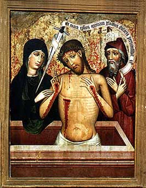 Jan Chrzciciel są interpretowani, jak reprezentanci całej ludzkości, proszący Boga o łaskę dla ludu. Na obrazie, pochodzącym z tarnowskiego muzeum, ukazany został Chrystus zmartwychwstały, w towarzystwie Matki Bożej i Jana Chrzciciela. Widoczna jest troska Maryi, która dotyka Jezusa ręką, okazując matczyną czułość. Po jego lewicy umieszczony został Jan Chrzciciel. Pojawia się tam także symbol średniowiecznego rycerstwa - miecz. Na rękach i boku Jezusa widoczne są rany-stygmaty, zadane mu przez oprawców. Korona cierniowa, wieńcząca jego głowę jest świadectwem upokorzenia, zadanym Synowi Bożemu. W oczach wszystkich przedstawionych na obrazie postaci malują się najwyraźniej przeżywane przez nich emocje. W spojrzeniu Jezusa kryje się cierpienie, z powodu zadanego mu przez ludzi bólu. Oczy Matki Bożej są pełne żalu i cierpienia, jakie przeżywała , patrząc na śmierć zadaną jej jednorodzonemu synowi. Jan Chrzciciel spogląda z żalem i współczuciem, jest reprezentantem ludzi, oczekujących na zbawiciela, który jednak zostaje zgładzony. Tak ja miało to miejsce w przypadku wcześniej opisywanego obrazu, drugi plan nie jest w żaden szczególny sposób wyróżniony. Tło obrazu nie może odwracać uwagi oglądającego od trzech postaci, które stanowiącego centralny punkt obrazu. Jednak taka pustka, pozostawiona przez artystę, ma za cel ukazanie, kto stanowi, stanowił i będzie stanowił najważniejszą jakość do przyszłych pokoleń. Chrystus był dla średniowiecznych chrześcijan wzorem, ideałem, z którym mogli osiągnąć zjednoczenie, poprzez posty, modlitwę i umartwienie. Jednak pomimo, iż obraz przepełniony jest smutkiem, postać zmartwychwstałego Chrystusa niesie nadzieję na odkupienie, zaś postacie towarzyszące mu stają się orędownikami ludzi, pośrednicząc w prośbach, zanoszonych do miłosiernego Boga.