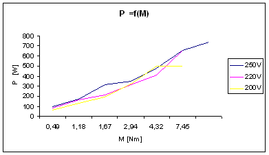 - wykres charakterystyki P = f (M) dla wartości napięcia 250V, 220V oraz 200V.