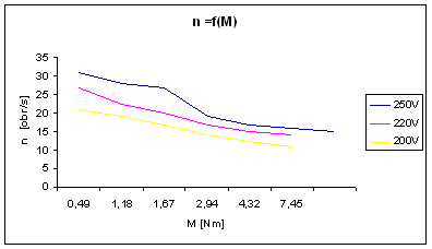 - wykres charakterystyki n = f (M) dla wartości napięcia 250V, 220V oraz 200V.