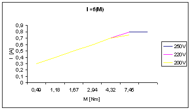 - wykres charakterystyki I = f (M) dla wartości napięcia 250V, 220V oraz 200V.