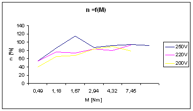 - wykres charakterystyki η = f (M) dla wartości napięcia 250V, 220V oraz 200V.