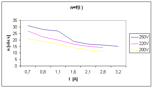 - wykres charakterystyki n = f (I) dla wartości napięcia 250V, 220V oraz 200V.