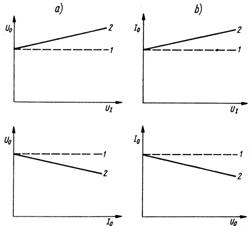 - charakterystyki wyjściowe U0 ( I0 ) i przejściowe U0 ( II ) stabilizatora napięcia