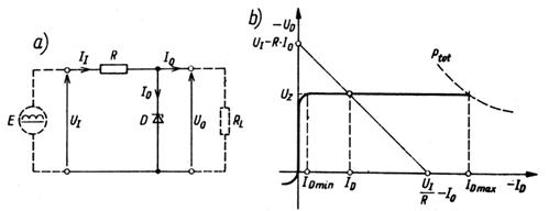 Poniższy rysunek przedstawia najbardziej elementarny układ stabilizatora parametrycznego oraz charakterystyki prądowo - napięciowe tego układu