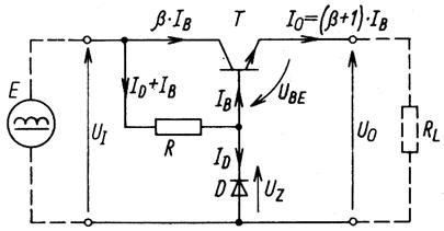 Tranzystor T pracuje jako wtórnik napięcia, przejmując cały prąd wpływający do obciążenia w taki sposób, że przez rezystor R przepływa jedynie niewielka część prądu obciążenia, jest ona bowiem porównywalna z prądem bazy tranzystora IB. Wyjściowe napięcie określone jest wartością napięcia stabilizacji UZ diody Zenera, która jest pomniejszona o niewielki spadek napięcia na złączu baza - emiter tranzystora T - UBE. Ponieważ wartość napięcia UBE ulega ciągłym zmianom w miarę przepływu prądu obciążenia płynącego przez tranzystor i może dochodzić do nawet 1V, stabilność napięcia wyjściowego w opisywanym układzie jest gorsza od układu opisywanego wcześniej. Możliwe jest uzyskanie dosyć dużego zmniejszenia napięcia tętnień na wyjściu poprzez zastosowanie rezystora R, charakteryzującego się dużą wartością rezystancji.