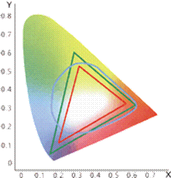 - RGB - jest zakres kolorów stosowany przez zwykłe monitory, odpowiada kalibracji programowej. Na wykresie został zaznaczony czerwonym trójkątem. Aby uzyskać właściwą temperaturę bieli tłumi się intensywność światła. Ponieważ ograniczeniu ulega zakres dynamiczny monitora, zmniejsza się liczba kolorów, które są możliwe do uzyskania na ekranie.