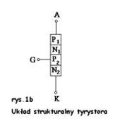 Tyrystor jest nazywany również sterowaną diodą półprzewodnikową. Składa się on z czterech warstw półprzewodnika o odpowiednim profilu domieszkowania: p - n - p - n. Wyprowadzenia tyrystora są podłączone do trzech z czterech warstw półprzewodnika. Anoda jest podłączona do warstwy skrajnej P1, katoda jest podłączona do skrajnej warstwy N2, natomiast bramka podłączona jest do jednej z warstw wewnętrznych - P2. Symbol elektryczny oraz układ strukturalny tyrystora są przedstawione na rysunkach poniżej.