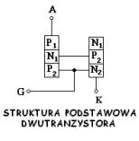Czterowarstwową strukturę tego typu, można przedstawić na elektrycznym schemacie zastępczym tyrystora, jako dwa połączone ze sobą tranzystory NPN oraz PNP. Działanie tyrystora zostanie przedstawione z użyciem właśnie tego dwutranzystorowego modelu, który przedstawiony jest na rysunkach poniżej.