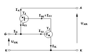Tranzystory T1 oraz T2 połączone są ze sobą w ten sposób, że prąd bazy tranzystora T1 jest zarazem prądem kolektora tranzystora T2. Analogicznie baza tranzystora T2 jest sterowana prądem kolektora tranzystora T1 wraz z prądem bramki IG. W miarę upływu czasu, kiedy prąd bazy tranzystora T1 narasta, zwiększa się zarazem prąd kolektorowy tego tranzystora. W związku z powyższym, również prąd bazy tranzystora T2 rośnie, co implikuje wzrost prądu kolektorowego tranzystora T2, a co za tym idzie, również wzrost prądu bazy tranzystora T1.Opisywany proces więc napędza sam siebie i zachodzi lawinowo, o ile współczynniki wzmocnienia prądowego obu tranzystorów α1 oraz α2 spełniają warunek α1 + α2 ≥ 1. α = β/( β+1), gdzie β jest współczynnikiem wzmocnienia prądowego, będącego stosunkiem liczby nośników, które są wstrzykiwane do kolektora, do ilości nośników znajdujących się w bazie tranzystora. β przyjmuje zazwyczaj wartości od 10 do 800 i wyraża się ją wzorem β = IC/IB.