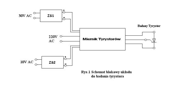 Przykładowy układ elektroniczny służący do badania tyrystorów, przedstawiony powyżej, składa się z dwóch zasilaczy stabilizowanych, a także z miernika tyrystorów. Zarówno bloki ZS1, ZS2, jak i sam miernik tyrystorów zasilane są z transformatora sieciowego o mocy 80 VA. Obwód pierwotny tego transformatora, poprzez wyłącznik, jest zasilany sieciowym napięciem zmiennym 220V, 50Hz. W wyniku transformacji otrzymujemy po stronie wtórnej trzy różne napięcia 110V, 30V, 10V.