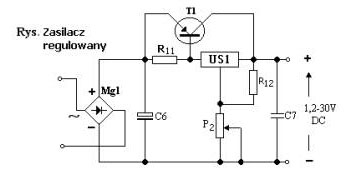 - Regulowany, scalony stabilizator dodatniego napięcia LM317, którego napięcie wejściowe zawiera się w granicach 1,2V - 30V - US1.