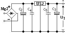 W bloku ZS2 napięcie podawane jest na mostek prostowniczy w układzie Greatza, poprzez dodatkowy bezpiecznik. Następnie napięcie jest filtrowane dolnoprzepustowo poprzez kondensator C2 o dużej pojemności. Stabilizator napięcia dodatniego - US2 wypracowuje na wyjściu sygnał o wartości 10V.