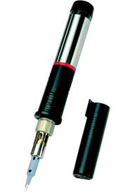 Obok znajduje się zdjęcie dosyć ciekawej lutownicy Nosi ona nazwę Super Pro, została wyprodukowana przez firmę Portasol. Przeznaczeniem lutownicy o tak małej masie jest konieczność niezwykłej precyzji. Nie widzimy tutaj pętającego ruchy kabla, co niewątpliwie poprawia warunki pracy. Lutownica jest wyposażona w kilkanaście roboczych końcówek, na które składają się groty o różnorakich kształtach, dysza wydmuchująca gorące powietrze i inne. Istnieje możliwość wykorzystania lutownicy jako palnika. Maksymalna moc to 125W. Bardzo ważną zaletą przy lutowaniu układów scalonych jest płynna regulacja temperatury, która osiąga maksymalne wartości: dla powietrza wydmuchiwanego 650°C, a dla grotu 580°C. Temperaturę najczęściej wykorzystywaną w trakcie pracy grot osiąga już w 20 sekund. Zbiornik gazu, może być naturalnie wielokrotnie napełniany zwykłym gazem używanym do zapalniczek. Pomimo tak wielu różnorakich funkcji lutownica ta waży zaledwie 165g!