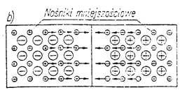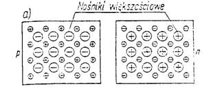Łącząc ze sobą dwa obszary typu p oraz typu n inicjuje się dyfuzję nośników większościowych do obszarów o mnejszej koncentracji ładunku. Następuje więc dyfuzja elektronów z obszaru typu n do obszaru typu p, oraz dyfuzja dziur z obszaru typu p do obszaru typu n. Dyfuzja ta jest przedstawiona na kolejnym rysunku.