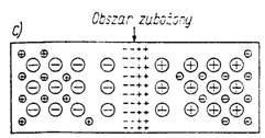 Na drodze dyfuzji w warstwie granicznej powstałej pomiędzy dwoma obszarami, po stronie obszaru n następuje zanik elektronów swobodnych. Pozostałe elektrycznie dodatnie jony donorów tworzą dodatni ładunek przestrzenny w tym obszarze. Analogocznie po stronie obszaru p niedostatek nośników większościowych w postaci dziur powoduje powstanie ujemnego ładunku przestrzennego. Obszar na styku obu obszarów półprzewodnikowych, w którym występuje zmniejszona koncentracja nośników większościowych nazywamy obszarem zubożonym. Schemat obszaru zubożonego jest pokazany na rysunku ponizej.