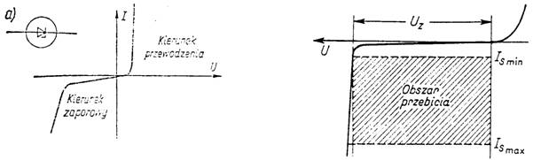 Dioda Zenera jest specjalną diodą krzemową, w której pracy wykorzystywane jest zakrzywienie charakterystyki napięciowo - prądowej w obszarze przebicia diody. Praca w obszarze przebicia nie jest szkodliwa dla diody Zenera, o ile nie przekroczy się mocy admisyjnej diody. Powodem znacznego wzrostu prądu diody, jest duży wzrost natężenia pola elektrycznego, które występuje w warstwie zaporowej. Wywołuje ono dwa zjawiska fizyczne: jonizację lawinową oraz jonizację Zenera. Jeżeli zanalizujemy diody o wąskich złączach, które powstają przy bardzo silnym domieszkowaniu, dla napięć rzędu kilku Voltów, powstające pole elektryczne posiada już tak duże natężenie, że następuje jonizacja Zenera. Polega ona na przechodzeniu mniejszościowych elektronów z pasma walencyjnego półprzewodnika typu p, poprzez barierę potencjału, do pasma przewodnictwa półprzewodnika typu n. Jonizacja lawinowa występuje z kolei w złączach szerokich, gdzie zastosowano niewielki profil domieszkowania. Polega ona na bombardowaniu atomów sieci krystalicznej przez elektrony o dużej energii, co powoduje lawinowe tworzenie się coraz co nowych nośników, które zwiększają znacząco prąd wsteczny diody. Napięcie wsteczne diody Zenera - UZ, przy którym charakterystyka prądowo - napięciowa w zakresie zaporowym gwałtownie się nachyla, zależy głównie od rezystywności jaką cechuje się użyty materiał krzemowy. Napięcie to zazwyczaj wynosi od kilku do kilkudziesięciu Volt. Spadek napięcia na diodzie Zenera znajdującej się w obszarze przebicia jest nazywany napięciem stabilizacji, ponieważ w zasadzie, w pewnych granicach, nie jest ono zależne od wartości prądu płynącego przez diodę. Zależy ono jedynie od dynamicznej rezystancji rZ, która wyraża sobą stosunek wzrostu napięcia stabilizacji DUS i przyrostu przepływającego prądu DIS. Podsumowując wzór na rezystancje dynamiczną przedstawia się w następującej postaci: rZ= DUS/DIS. Rzeczywista wartość rezystancji dynamicznej charakterystycznej dla zakresu stabilizacji jest bardzo mała, z tego powodu przyjmuje się, że napięcie stabilizacji równe jest co do wartości napięciu Zenera - UZ. Wartość maksymalna prądu przy której dioda Zenera pracuje bez uszkodzeń - Imax, ograniczona jest mocą dopuszczalną Pmax która może się wydzielać na diodzie, zgodnie ze wzorem Ismax = Pmax / Uz. Diody Zenera są powszechnie stosowane, w różnego rodzaju układach stabilizacyjnych, układach ograniczających napięcie, są również stosowane jako stabilne źródło napięcia referencyjnego. Na rysunku poniżej przedstawiona jest cała charakterystyka diody Zenera oraz bardziej szczegółowa charakterystyka obszaru przebicia diody.