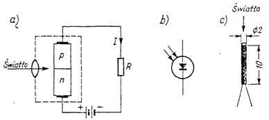 Fotodioda jest złączem p - n, które wykrozystuje zjawisko generowania nośników mniejszościowych, pod wpływem energii dostarczanej przez światło. Fotodioda spolaryzowana jest stałym napięciem w kierunku zaporowym i jest oświetlona przez specjalne okienko umieszczone w obudowie obszarzu złącza diody Kiedy fotodioda nie jest oświetlona przepływa przez nią niewielki wsteczny prąd, nazywany prądem ciemnym, który powstaje wskutek istnienia termicznie generowanych nośników mniejszościowych w obszarze złącza. Poprzez oświetlenie fotodiody zarówno w obszarze złącza, jak i na granicy pomiędzy obszarami typu p oraz n, wzrasta znacznie liczba nośników mniejszościowych, powodując zwiększenie natężenia prądu płynącego w obwodzie. Dzieje się tak dlatego, że kwant energii padając na obszar złącza dostarcza elektronom energię, powodując powstawanie par elektron - dziura. Fotodiody najczęściej wykonywane są z krzemu lub germanu. Czynnikiem przemawiającym za stosowaniem germanu jest większy, w porównaniu do krzemu, prąd fotoelektryczny który może być generowany. Zaletą krzemu z kolei jest mniejsza wartość prądu ciemnego. Największa czułość fotodiody występuje dla promieniowania o długości fali odpowiadającej 0,7 mm dla krzemu oraz 1.5 mm dla germanu. Na rysunkach poniżej przedstawiono schemat układu pracy fotodiody, jej symbol elektryczny oraz widok zewnętrzny.